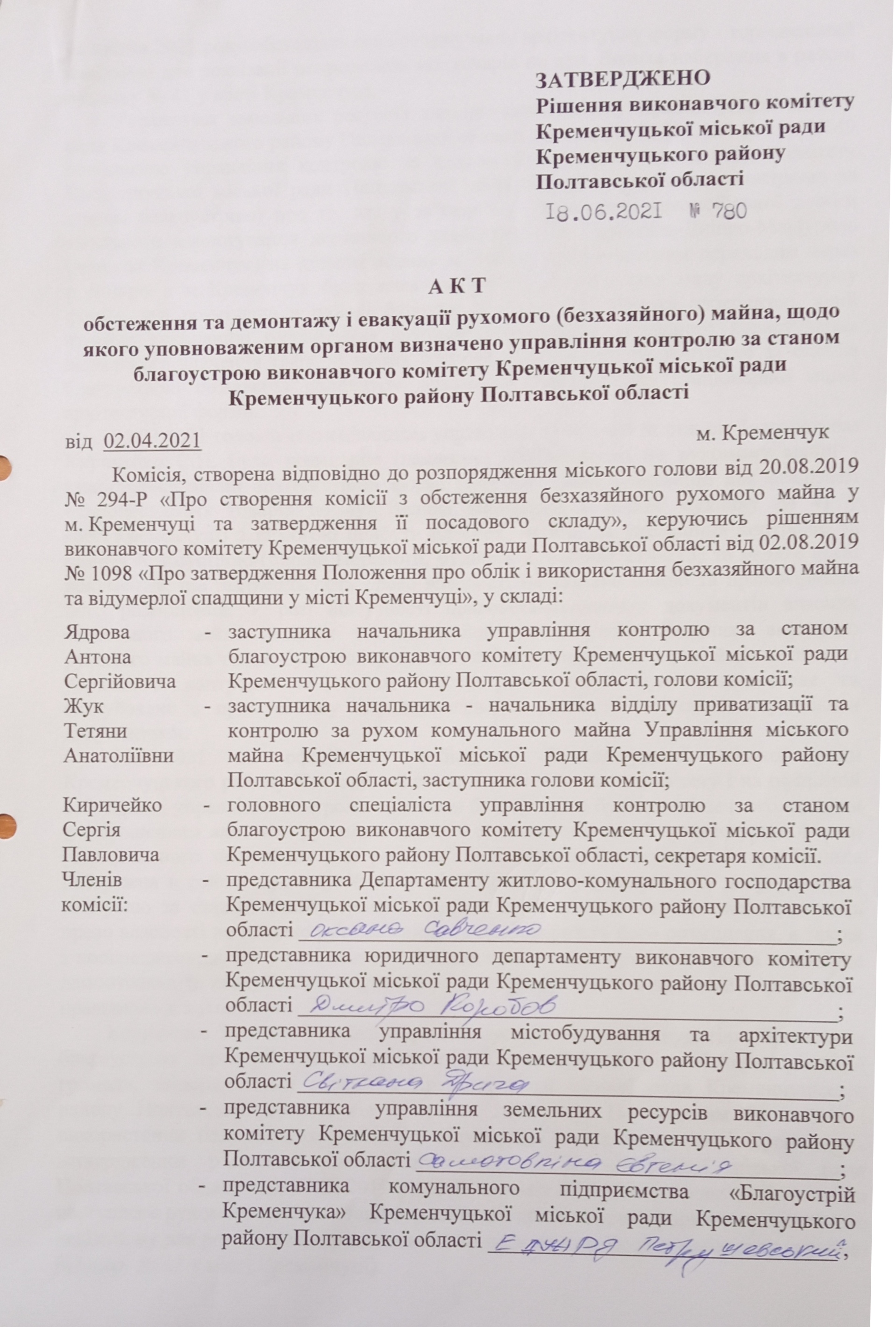 Про затвердження акта обстеження та демонтажу і евакуації рухомого (безхазяйного) майна, щодо якого уповноваженим органом визначено управління контролю за станом благоустрою виконавчого комітету Кременчуцької міської ради Кременчуцького району Полтавської області
