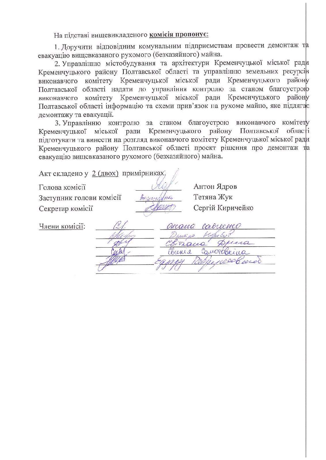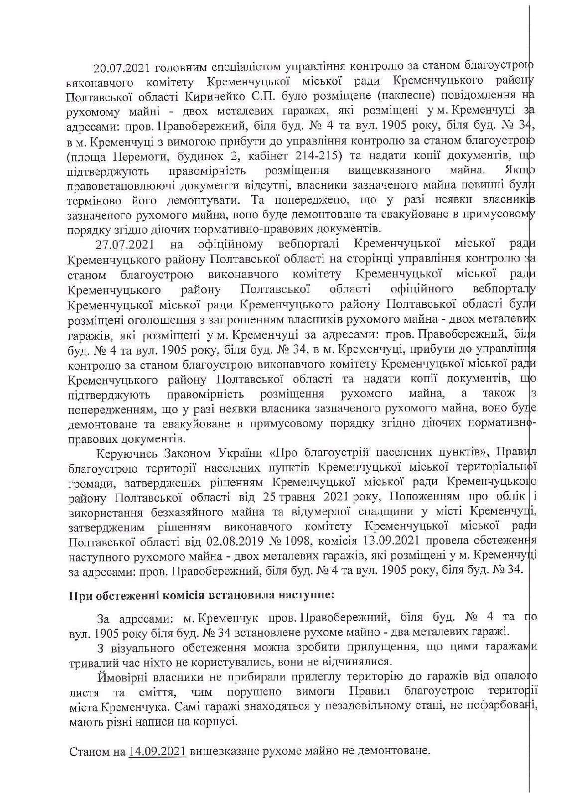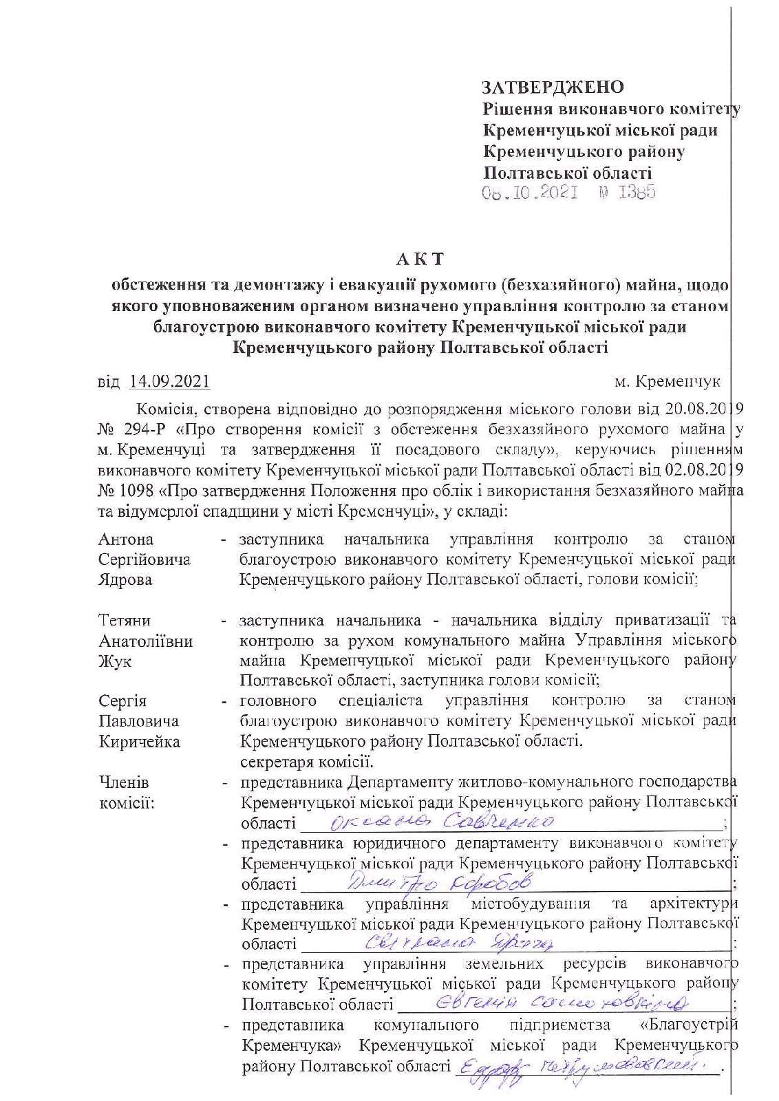 Про затвердження акта обстеження та демонтажу і евакуації рухомого (безхазяйного) майна, щодо якого уповноваженим органом визначено управління контролю за станом благоустрою виконавчого комітету Кременчуцької міської ради Кременчуцького району Полтавської області